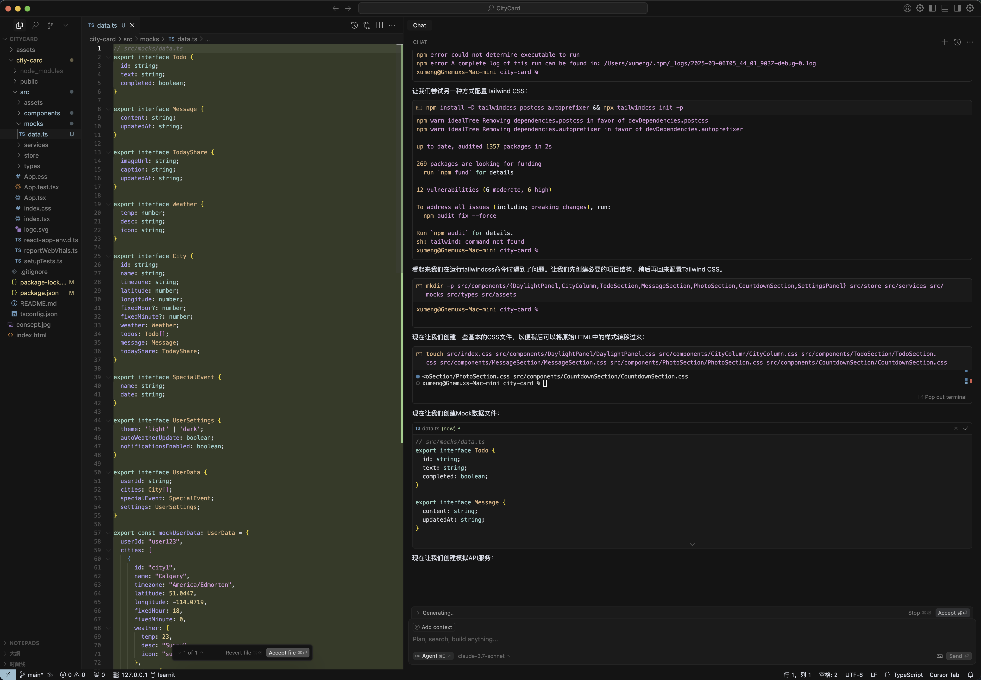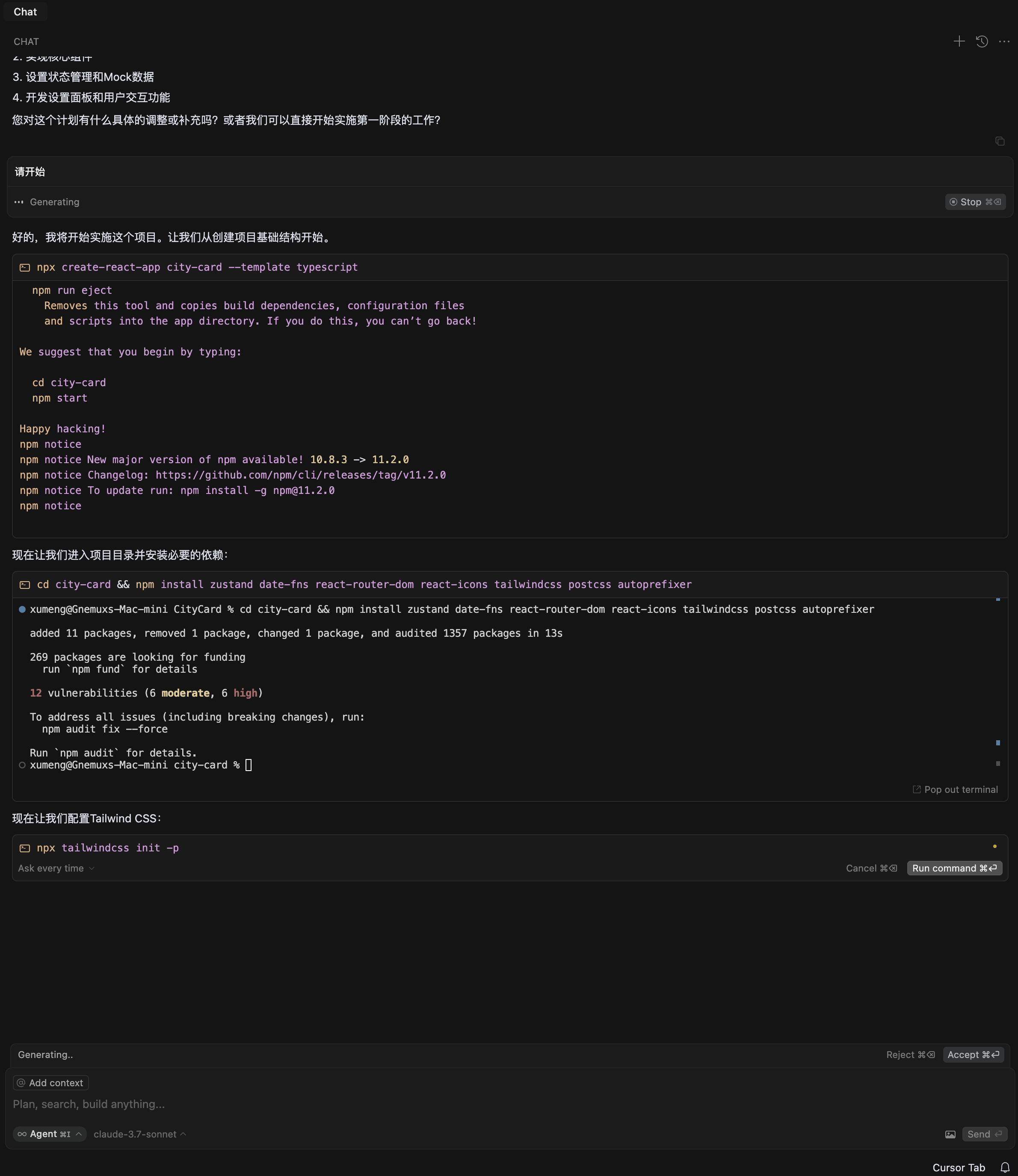 由于需要使用到一些 npm 包,因此它主动输出了一系列命令去在本地安装这些依赖,我要做的只是点击接受。 当其中某一步配置出错时,它还会意识到问题并尝试另一种方式去执行,直接到成功为止,我要做的还是点击接受即可。