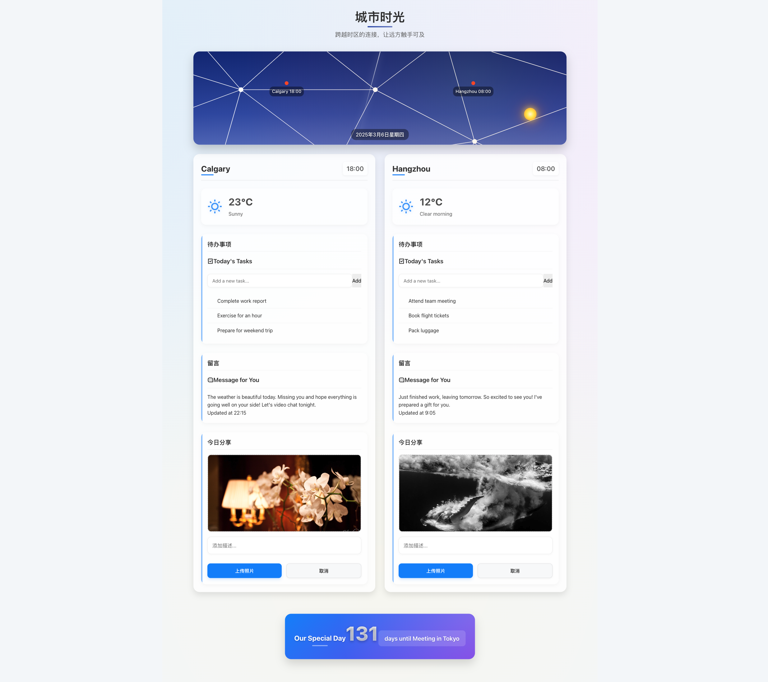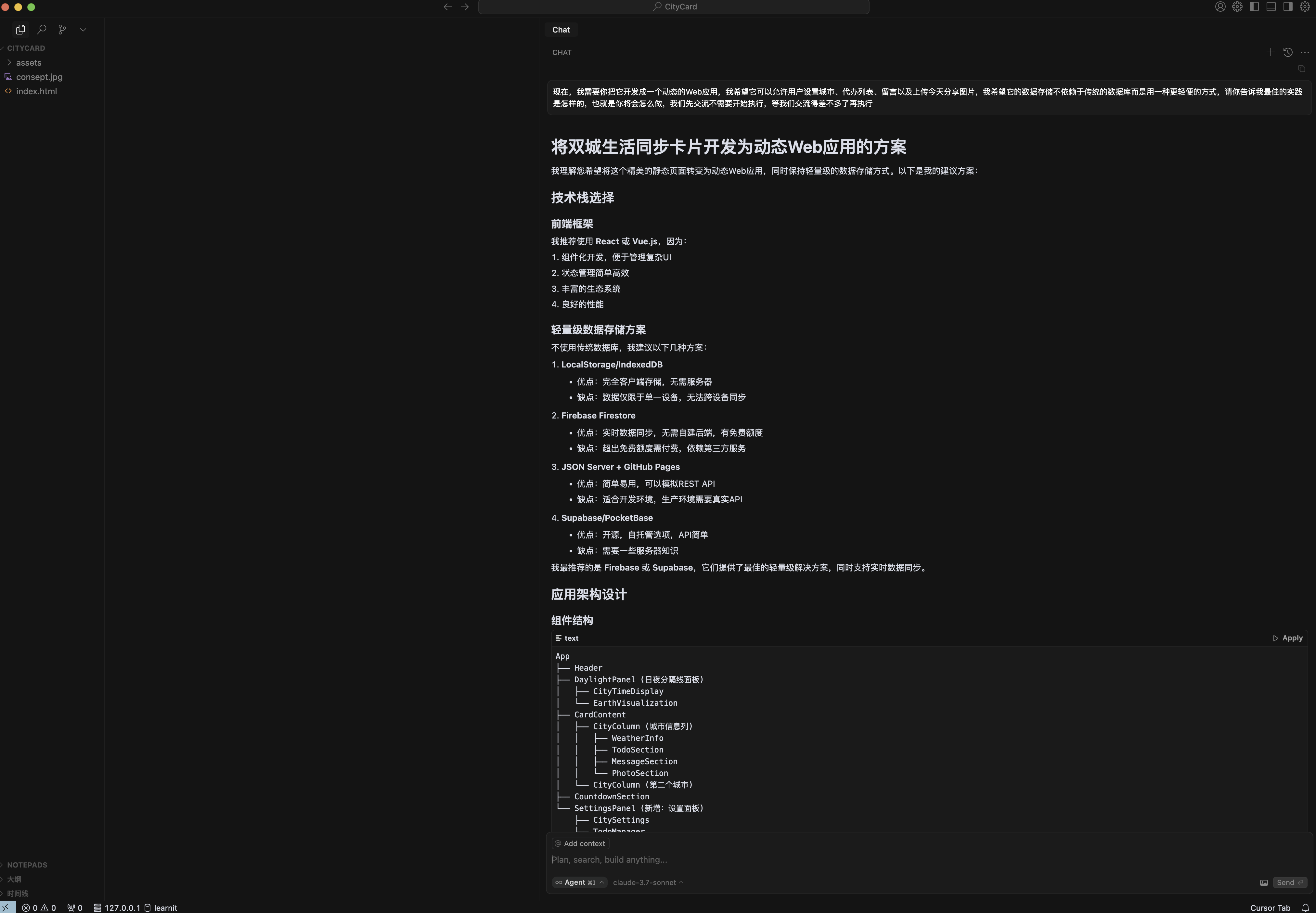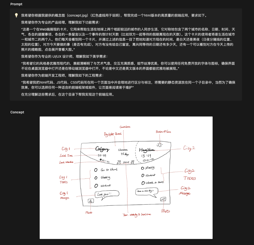 我尝试了以下提示词,并手绘了一张概念图手稿,希望 Claude 可以结合我的要求和手稿进行生成一个我有在脑海中构思过,来原于生活的关于两个城市互动的卡片应用生成。
