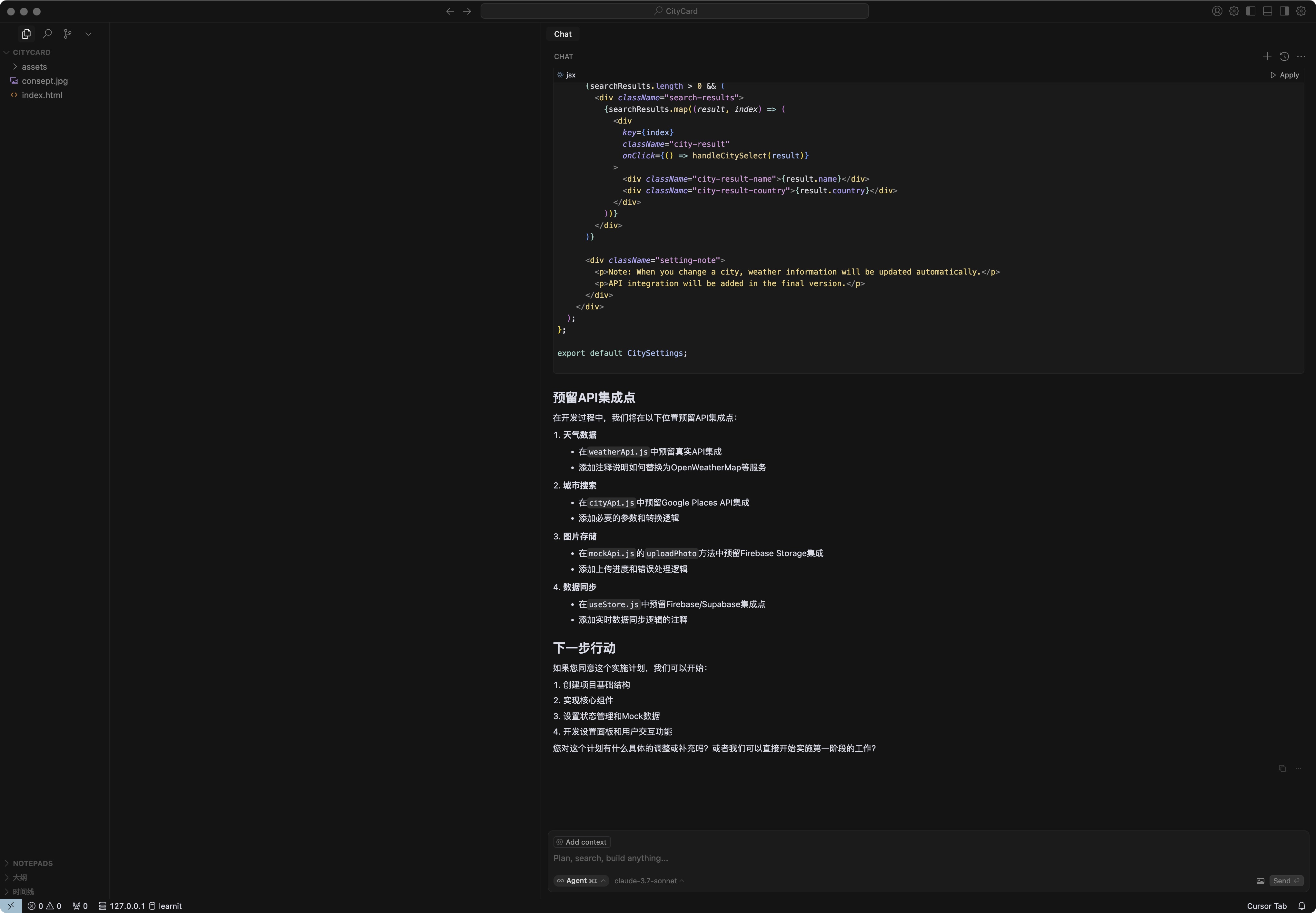 又让它进行了一通修改后,已经好多了,不论如何它已经几乎是一个动态的应用了(后续我只要把 Mock 数据换成外部接口就行),更重要的是整个过程它是完全自己一步一步自动完成了,遇到错误也会自己重新切换思路尝试,这就是 Agent 的力量。
