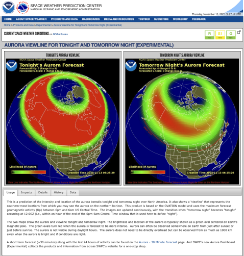 耀斑之后紧跟着一枚速度超过 1300 km/s 的日冕物质抛射 (CME) 直指地球,像一阵席卷而来的磁暴风。这种爆发本就少见,更难得的是它正面冲击地球,结果就是把原本只属于高纬度的极光一路向南“推”,使得北美许多平时见不到极光的州也突然成为“极光观测点”。
