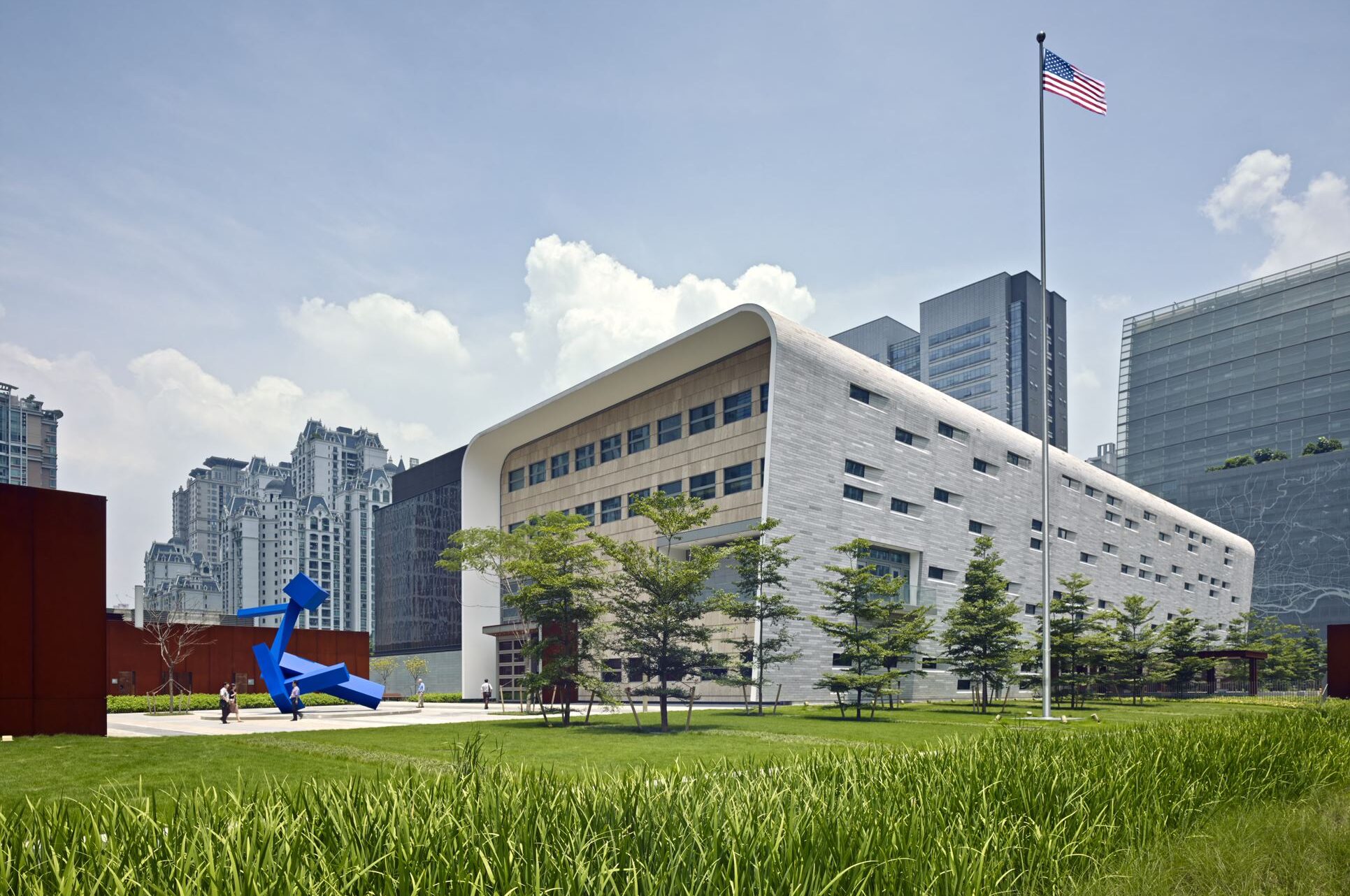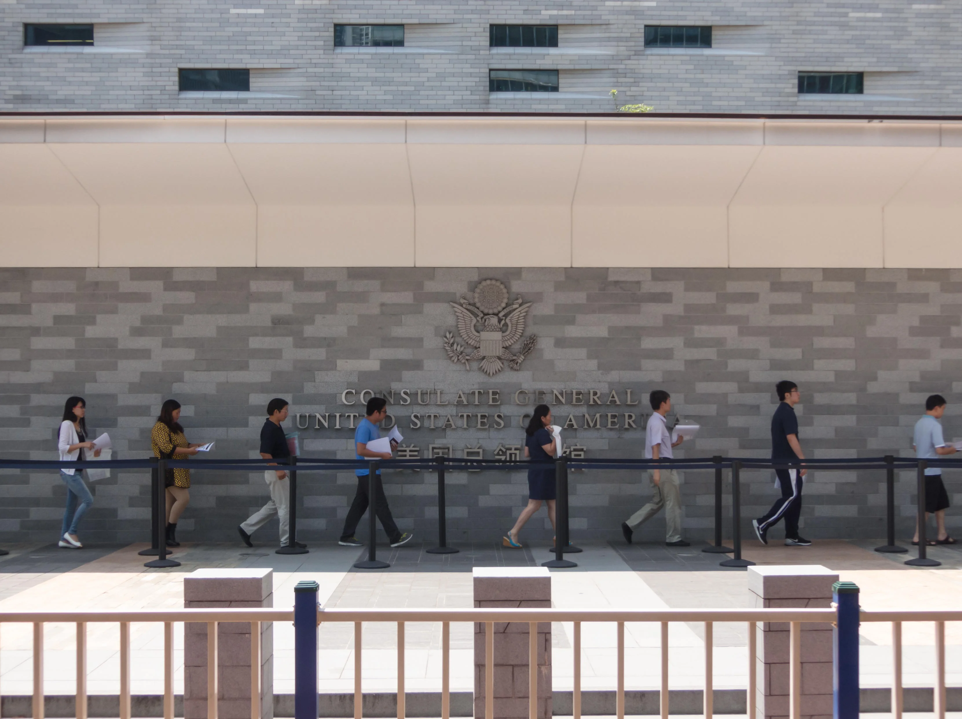 - 07:25 到达领馆,领馆是一个由围墙环绕的大型建筑,门口写着美利坚合众国驻广州领事馆。到的时候已经排了两个折返的队伍在领馆稍贴着围墙的外面了并且不断还有人过来,大部分是华人,有一两个非裔