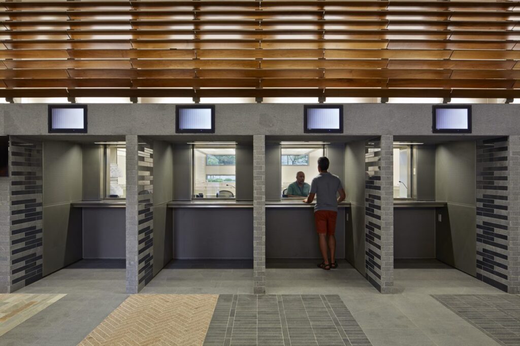 这些窗口被分为三个区域:给护照、录指纹、面签,一个一个窗口排过去。