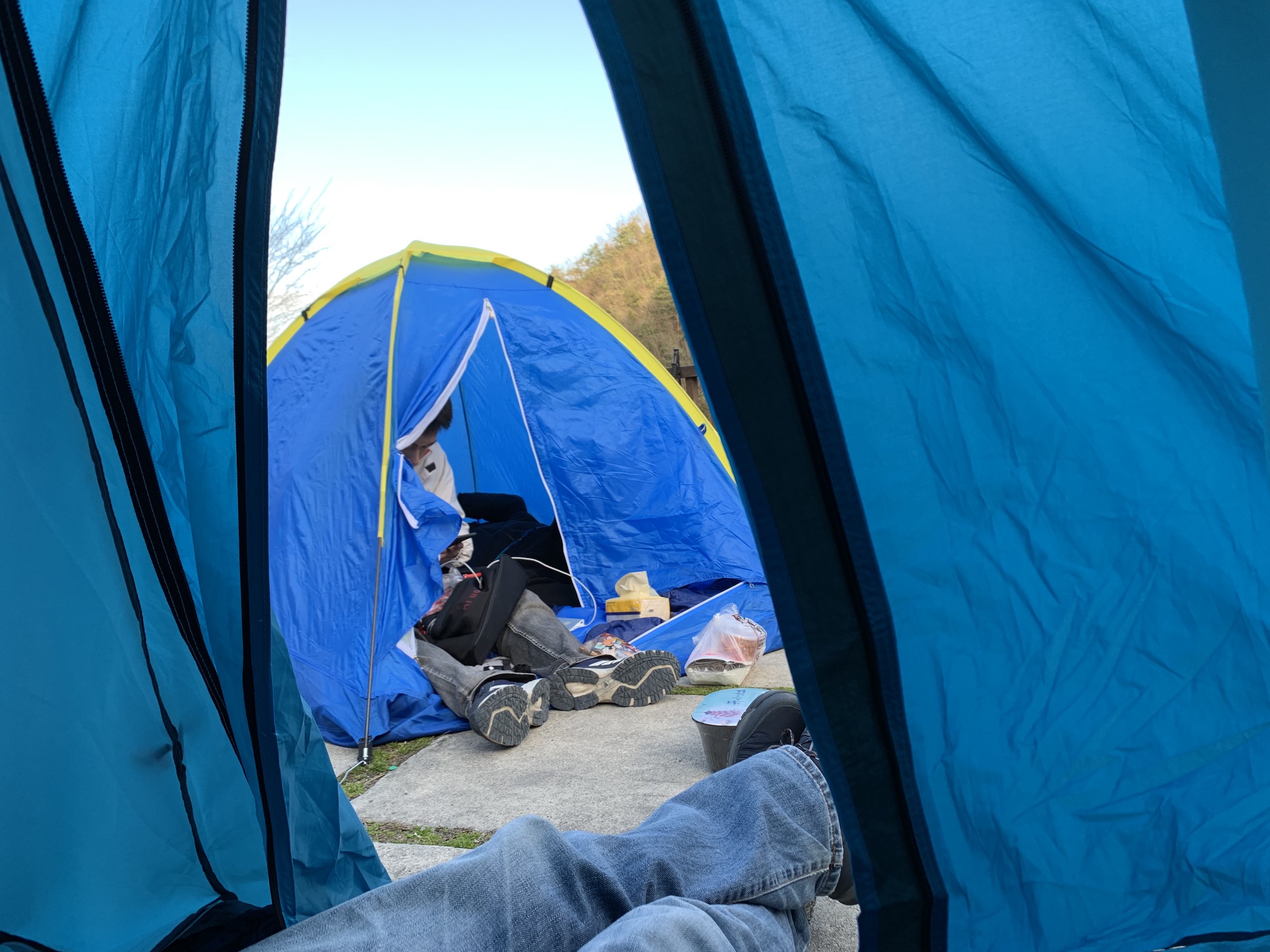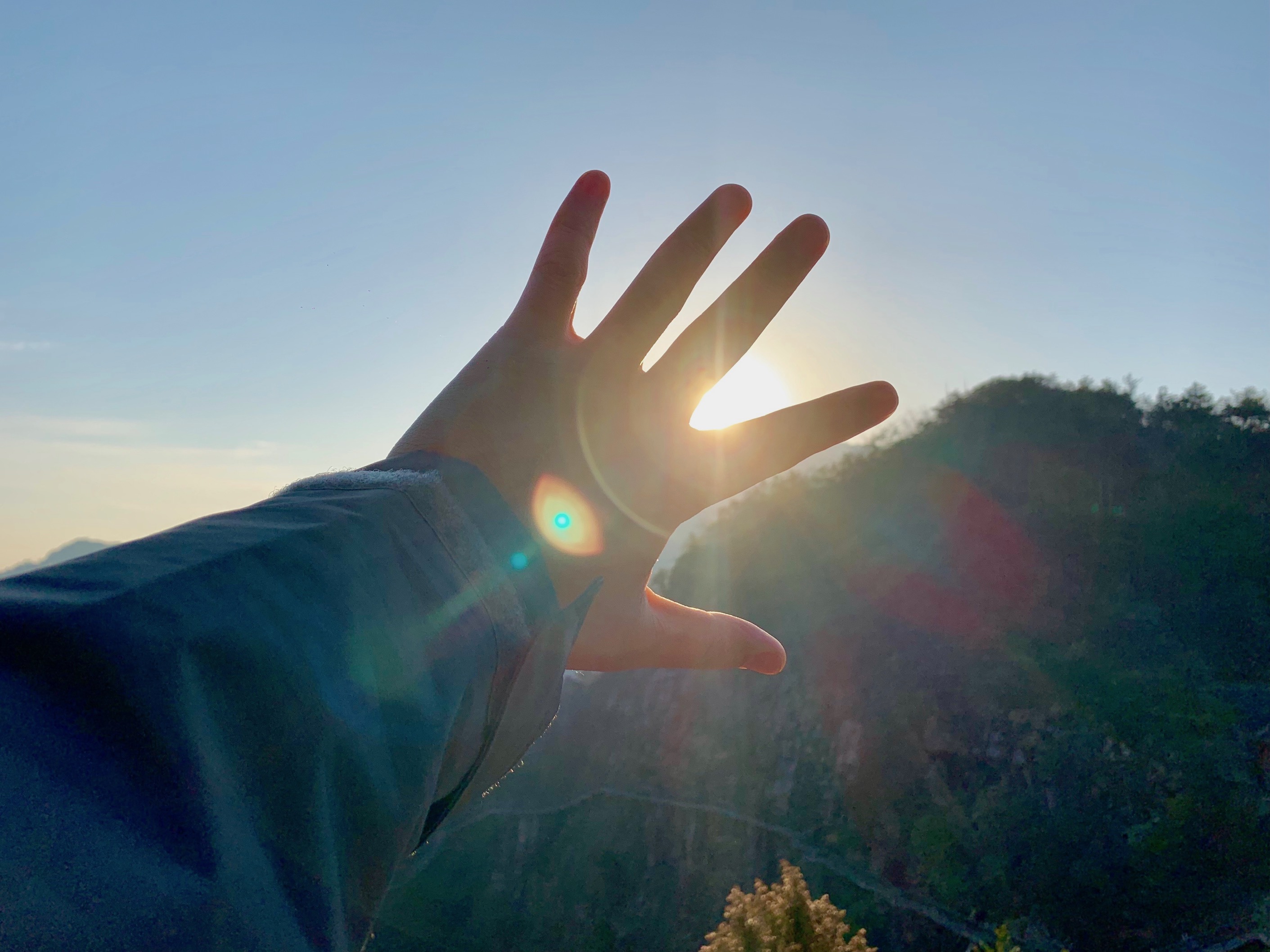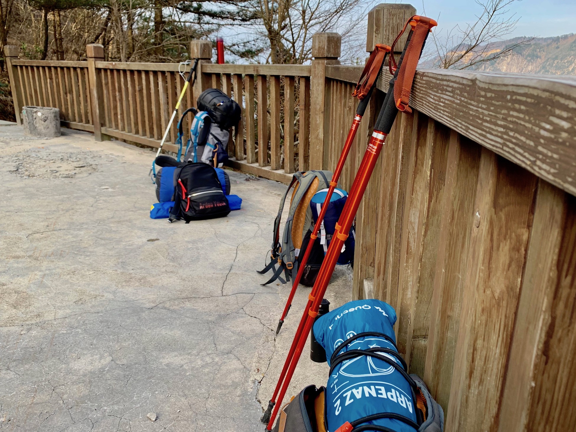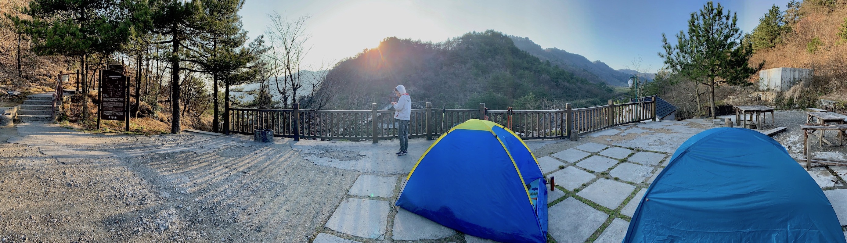 凌晨5点,还是能感觉的些许料峭的春寒,不情愿地从睡袋中钻出来,才发现在晨曦中的这片露台还是别有一番风味。我们向留守的保安大叔要了些热水,坐露台上的破木桌前,从五月天的《自传》聊到了许巍的《无尽光芒》,这可能就是像这样的徒步旅程的真谛所在。