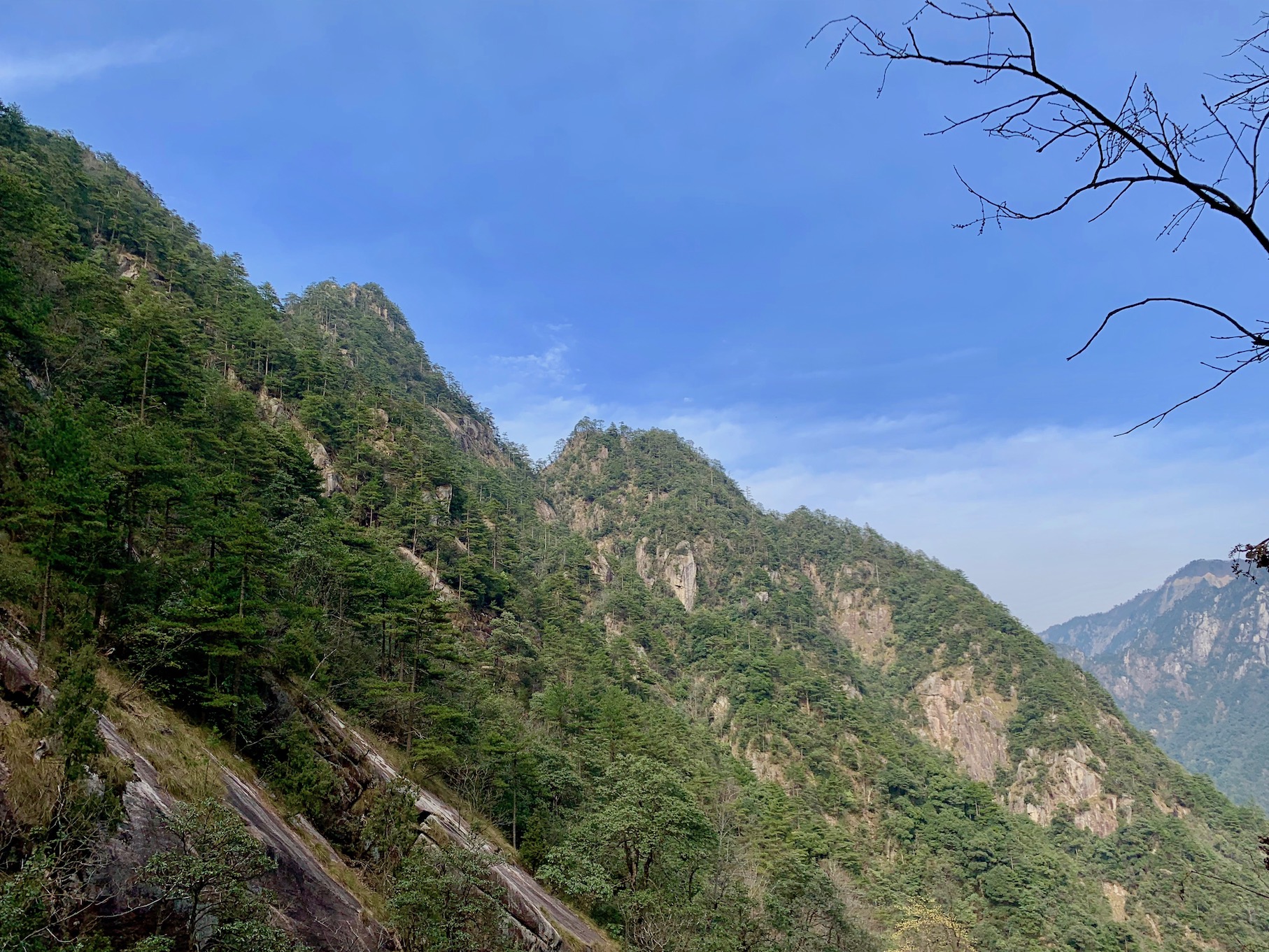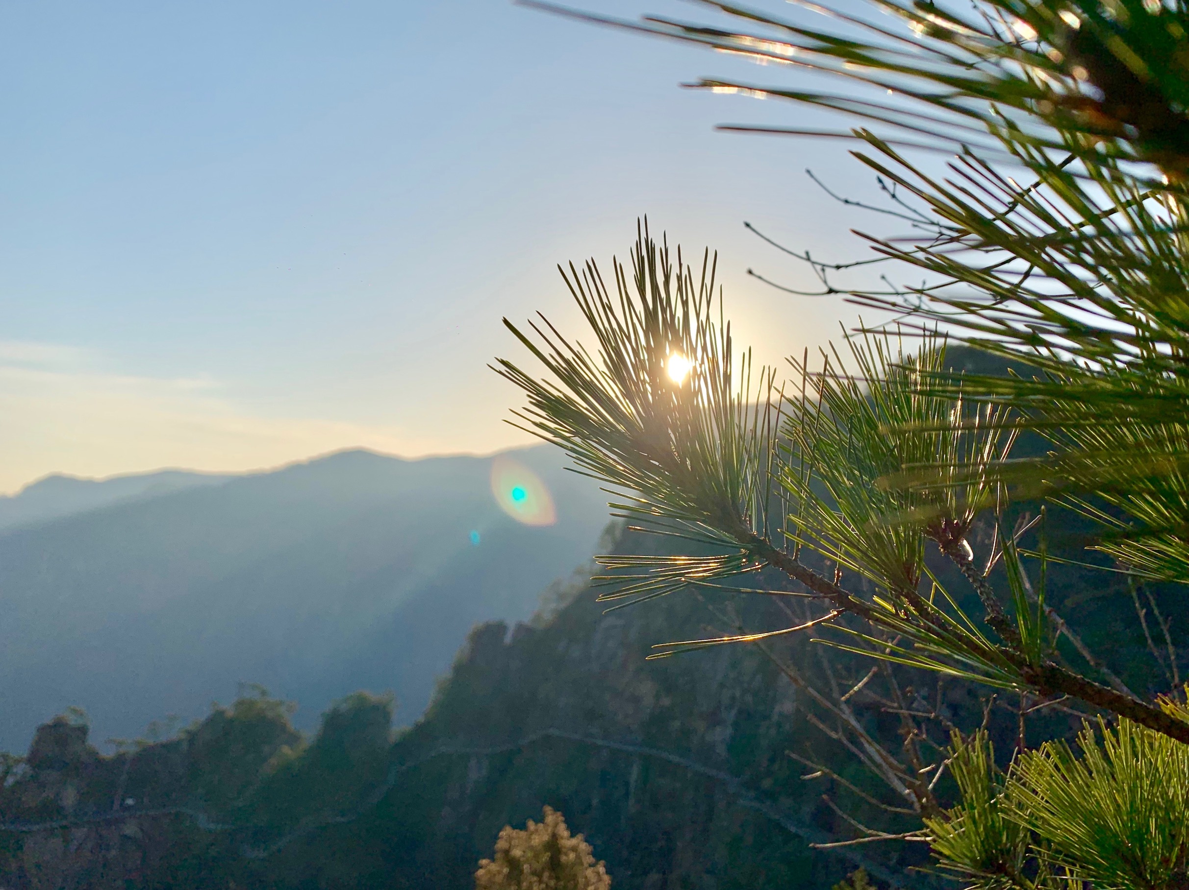 整座山的山路都已经是石头台阶,其余的就是索道和悬空栈道,登山的人还是不少,但背着帐篷准备在山顶露营的人貌似只有我们一组。毕竟是1100米左右的海拔,对于最近缺少运动的我们几个来说,2小时的连续攀登还是有些累,但这也是这次出行很重要的一个目的。 一路上的风景真是极好的,陡峭的山壁和沿着山壁斜着生长的黄山松,苍劲奇险,真是现实中难得一见的景观。