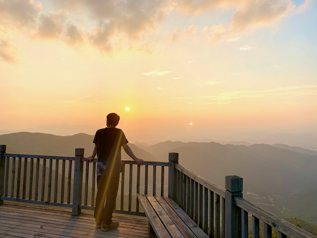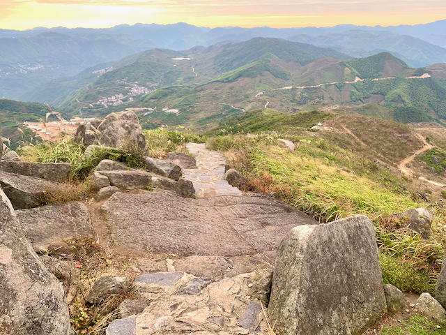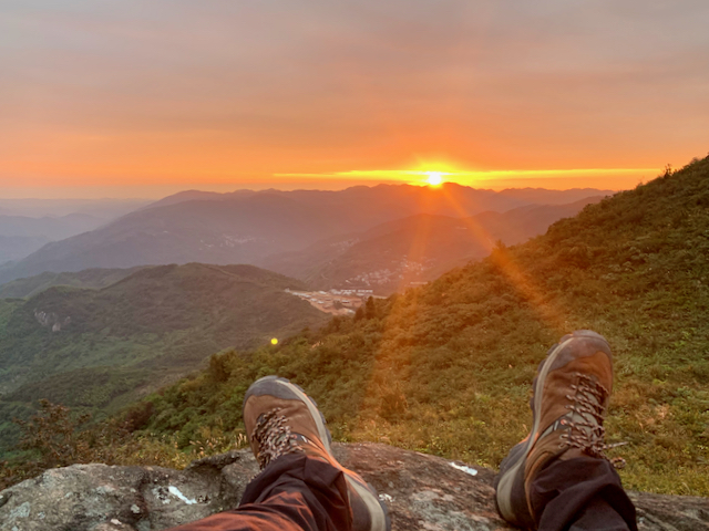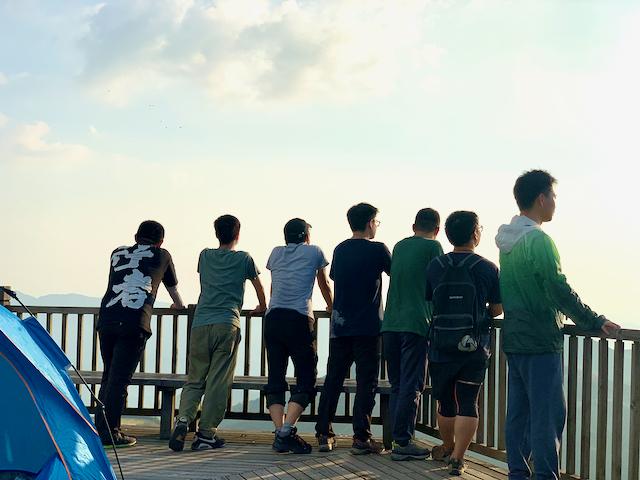 我们落脚在离最高顶只有几十米之遥的一个观景平台,太阳开始落山时,稀疏的游客们都下山去了,把这绝美的霞光留给了我们,说幸福感也是不为过的。三顶帐篷达7个人,达到了露营活动以来的人数之最。吃完了饭,喝了点酒,在八月十六正圆的明月下,畅谈,人生此刻足矣。