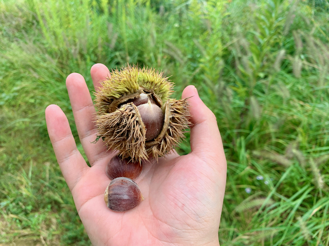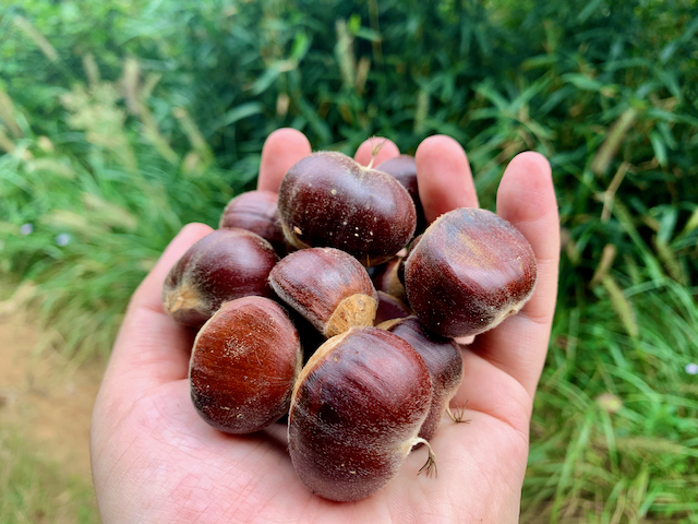 从来没想到,下山这一路所经历的景象竟然可以一样让人印象深刻,我觉得我们走的路线可能不太对,但也正是因此我们仿佛走进了一片未开垦的神秘领域,有齐身高的茅草和斑斓的花朵,还有沿路上随处可捡到的野生栗子,于是我捡了一些回去,放在女儿的玻璃罐子里和松果们放在一起,储藏这2020年的秋天和这段不一样的回忆。
