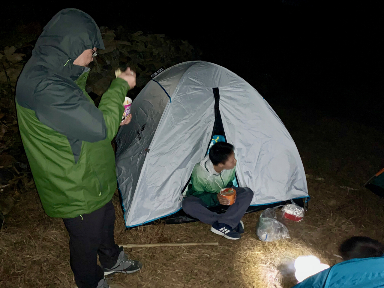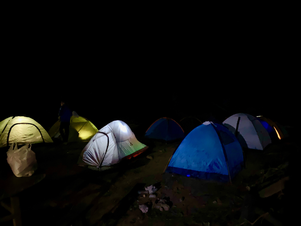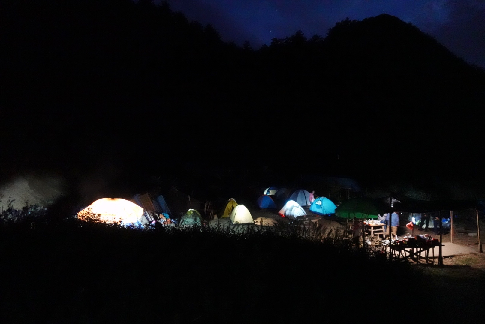 此时的蓝天凹已经完全没有蓝天,有的是星星点点的营地灯在帐篷中摇曳。气温也降到了10度以下,穿着短袖短裤的我,赶紧安营扎寨,弄一点热乎的吃