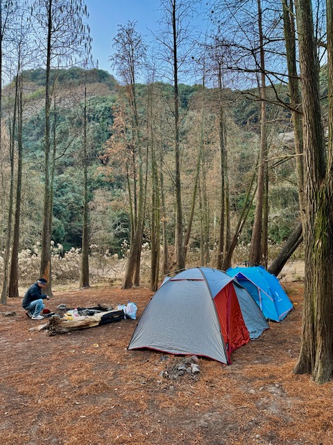 从萧山出发,约1.5小时来到宁波,吃个中饭就出发去到离露营点最近的清修寺。这次的目的地是一片水库边的红杉林,停下车背起行囊往露营地红杉林出发。