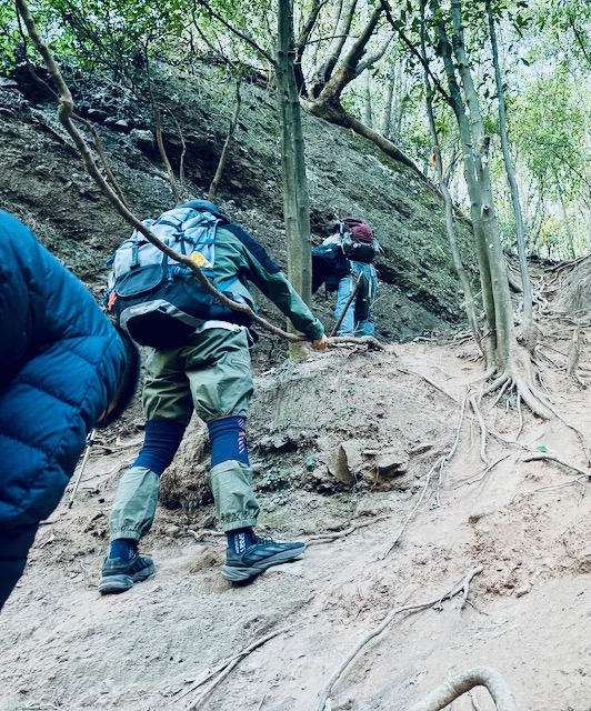 这一路从白天走到黑夜的行程还是充满了各种回忆点,从因为错过正确的路口走到水库边的峭壁绝路又不得不无奈返回,再到遇到两位跟我们一样走错路的朋友的救助,再到教授飞丢一架无人机,再到五人在山路的灌木丛中寻找出路..