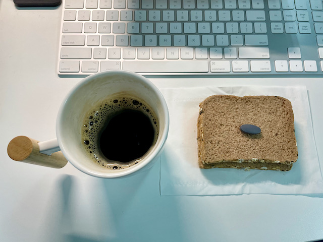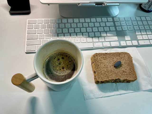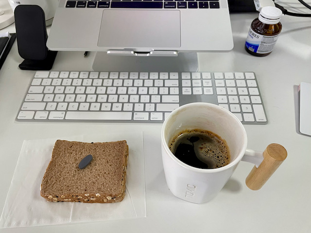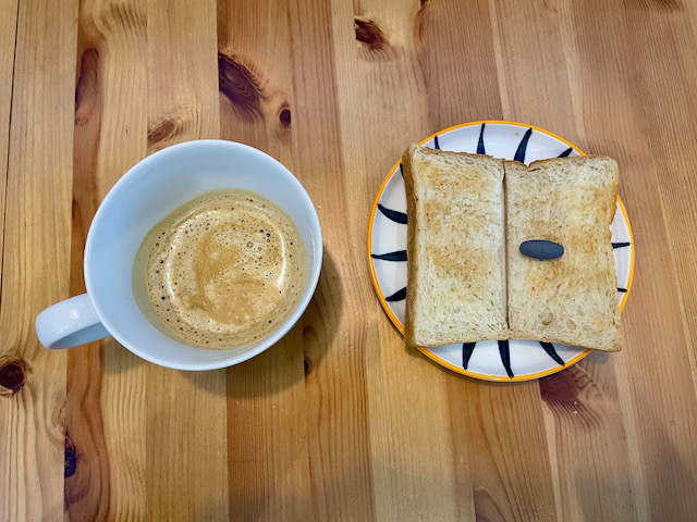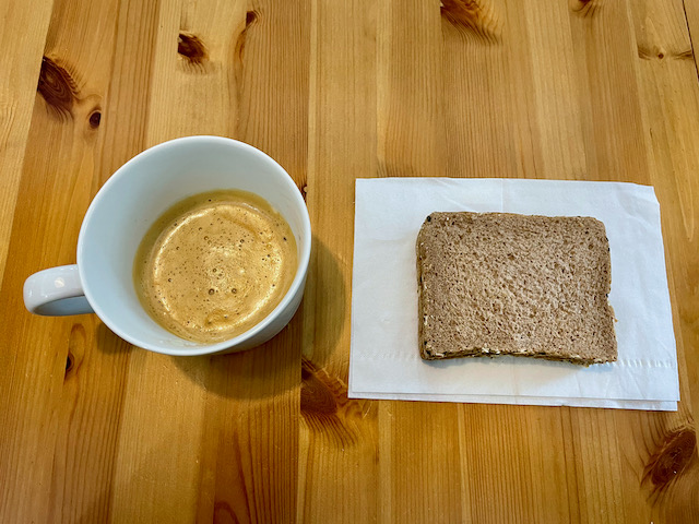 早上起来,感觉没什么力气。早上吃了片面包,喝了杯咖啡,马上感觉好点了。整体来说前6天我并没有什么不适,出乎我意料,明天是吃得很少的一天,希望能坚持。中午要是吃得晚,还是有点低血糖带来的无力感。