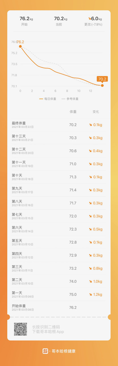 这13天,感觉就在一开始的几天有来自生理上的饥饿感的煎熬,到了第三天左右,其实就不那么饿了,应该是身体适应了减少摄入,从而从依赖糖分转而依赖消耗自身产生的酮。再后面的几天,纯粹是来自精神上的煎熬,『想吃面食和一切淀粉类的东西』。总之,整个过程的效果是明显而迅速的,但还是不建议长期使用这样的方式减重。断绝碳水和轻断食,应该还是用来间歇性调理用更好,长期来看还是要『减少』碳水和脂肪的摄入并保持充分运动更为健康。
